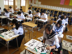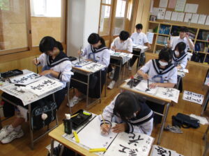 毛筆を行いました。生徒たちは真剣な表情で筆を走らせていました。
