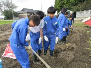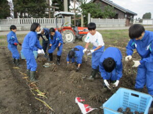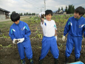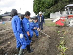 3年生 いなみの時間 2025年10月30日 に 管理者 が投稿 10月29日(水) 3年生はいなみの時間で食、環境、地域活性化、エコの4つのコースに分かれて課題追究活動を行っています。今日は食コースの生徒は山野地区にある里芋畑で里芋堀り体験をさせていただきました。