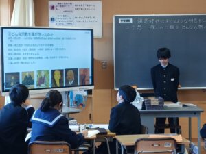 1年生 社会 「鎌倉文化について調べよう」 2025年11月12日 に 管理者 が投稿 11月12日(水) 1年生は鎌倉時代について学習しています。今日は鎌倉時代の文化についてグループごとに調べました。どのグループも分かりやすくスライドにまとめて発表することができました。
