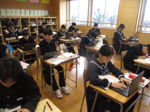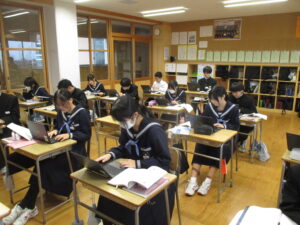 タブレット端末を使用して、説明的文章の要約に取り組みました。集中して教科書の文章を読み返しています。