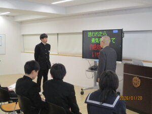 2年生 薬物乱用防止教室 2026年1月21日 に 管理者 が投稿 1月20日(火) 2年生は、講師の先生をお招きして薬物乱用防止教室を行いました。 ロールプレイを行いながら、タバコやアルコールの害、薬物乱用防止についての理解を深め、誘惑に負けない強い心をもつことの大切さを学びました。