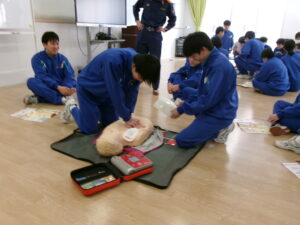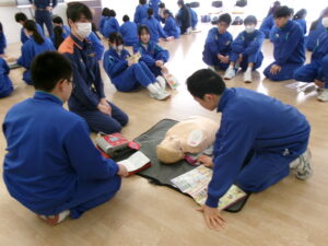 2年生保健体育 AED講習 2026年1月23日 に 管理者 が投稿 1月21日(水) 2年生は保健体育の授業で、消防士の方をお招きしてAED講習会を行いました。 胸骨圧迫やAEDの使用方法について学び、手順をしっかりと確認しながら人形を使って体験しました。