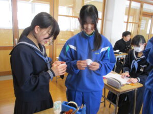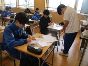 1年数学「立体の展開図」 2026年1月28日 に 管理者 が投稿 1月28日(水) 1年数学では、立体の展開図について学習しています。今日の授業では、円錐の展開図がどのような形になるかを予想し、実際に紙に描いたものを組み立てて、確かめてみました。